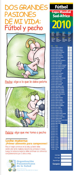 La OPS creó material de promoción de la lactancia materna para la Copa Mundial de Sudáfrica - 2010, utilizando la reproducción de un trabajo expuesto en la "Primera Muestra Argentina de Humor y Lactancia Materna", realizada en 1999. Clic aquí y vea el material en pdf.